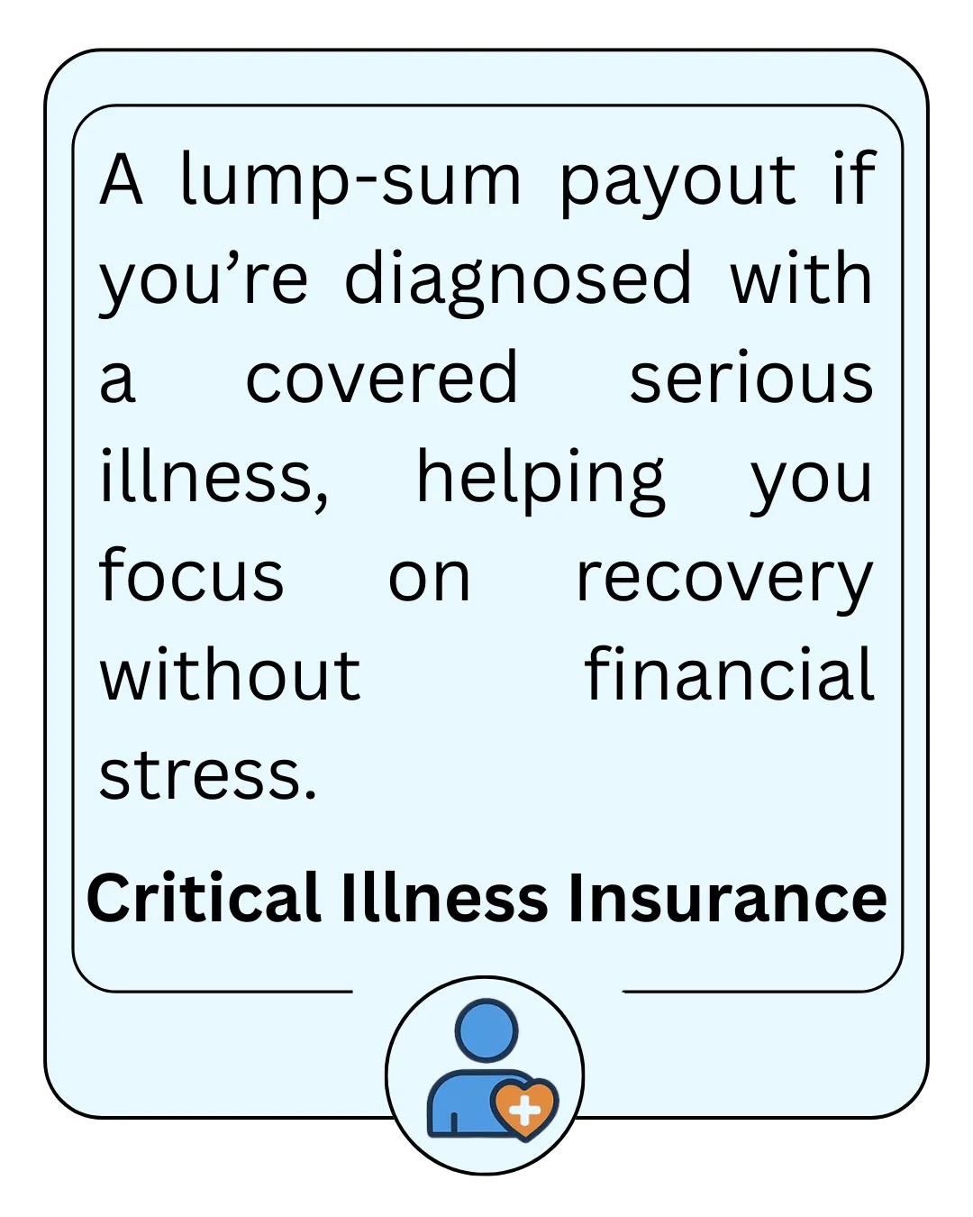 Yes—health insurance helps with medical bills, but Critical Illness provides a lump-sum cash benefit you can use for anything (deductibles, income gaps, travel for treatment, or household bills).