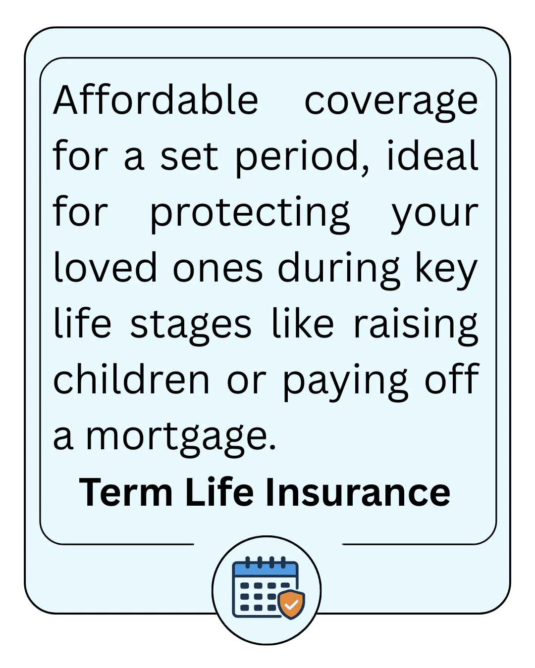 Term Life covers you for a set period (e.g., 10–30 years) at a lower cost—great for budget-friendly protection. Whole Life lasts your entire lifetime, builds cash value, and can be used as a financial asset.